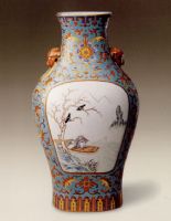 圖片名稱: 綠地粉彩開光山水人物圖獸耳瓶