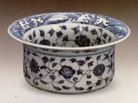 說 明: 釉面光滑細潤.以"蘇麻離青"料繪畫,青花發(fā)色濃艷,畫筆生動,為永樂時期的新造型,系受西亞文化影響下的產(chǎn)物.