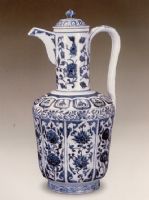 說 明: 此壺仿十三世紀(jì)敘利亞金屬器式樣燒制.瓶體高大,全器紋飾繁密,青花色澤濃艷.