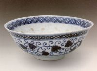 說 明: 此碗胎薄質(zhì)細,色潔白,內(nèi)外施滿釉,釉色白中閃青,釉薄光潤且勻.造型秀麗,青花色澤濃艷,制作精致.