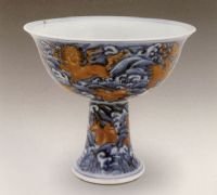 說(shuō) 明: 此杯在釉下以青花海水作為地色,釉上用礬紅料染繪海獸,構(gòu)圖十分新穎.是宣德青花加彩器中的杰作.