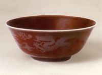 說 明: 紅釉描金器始于明宣德朝.此碗金彩雖已脫落,圖案仍依稀可辨.足內(nèi)白釉.