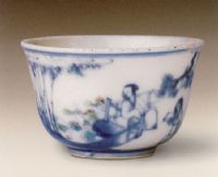 說 明: 此杯構(gòu)圖平遠(yuǎn)開闊,意境高雅恬靜.采用"點(diǎn)彩"技法,呈色古雅而不清冷,是成化斗彩瓷器中別具一格之作.