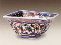 說 明: 方斗杯是明代嘉靖時(shí)期特有的器型之一.此杯整體構(gòu)圖較為飽滿,青花與紅彩為主要色彩.這兩種色彩反差較大,鮮麗明亮,為嘉靖時(shí)期獨(dú)特的用彩方法.