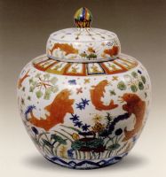 說 明:  此罐直口,平底.繪游魚浮沉于荷花水藻中,畫面構(gòu)圖疏密得體,生動逼真,富麗堂皇.外底青花楷書"大明嘉靖年制"六字款.