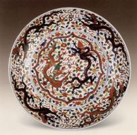說 明: 此盤構(gòu)圖飽滿,畫面突出紅彩,艷麗奪目,為萬(wàn)歷五彩瓷器中之精品.