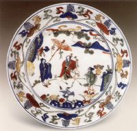 說(shuō) 明:  此盤制作精美,色彩艷麗,人物刻畫惟妙惟肖,寓意吉祥長(zhǎng)壽,為萬(wàn)歷五彩器的佳作.