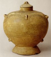 說(shuō) 明: 器體俯視呈橢圓形,正視呈桃形,體外施淡黃釉,胎釉結(jié)合不牢,部份釉已脫落.