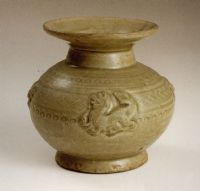 說 明: 此器的貼塑紋飾技巧頗高,在同類器中屬出類拔萃之作,辟邪形象活潑生動,栩栩如生,甚屬難得.