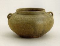 說 明: 整器施青釉,釉不及底,釉面光亮有集釉現(xiàn)象.此器平口、高領(lǐng),飾帶狀紋是前代的遺風(fēng).