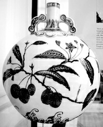 明代五彩、青花瓷器展品幾乎都是景德鎮(zhèn)燒制的官窯器,五彩繽紛,花枝招展,正合西洋人喜歡華貴熱鬧的個性特點,極具觀賞的藝術(shù)效果。最名貴的要數(shù)明成化的斗彩雞缸杯。據(jù)趙汝珍著的《古玩指南》記載:“明成化窯斗彩雞缸杯,現(xiàn)存僅三只。”而大英博物館就有兩只,真讓人大開眼界。明正德皇帝在位16年,淫樂嬉游,縱情聲色;后因大興土木擴建皇莊,不惜掠奪人民土地,激起人民反抗。正德年帶款五彩瓷器比較少見,這里展示的香爐、花瓶等都是難得一見的珍寶。