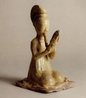 說 明: 俑白胎,通體黃釉,并施彩繪,年久已脫落.此俑是黃釉樂舞俑群中的一員.