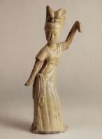 說 明: 此俑是黃釉樂俑群中的一員,出土?xí)r雙臂已殘,后修復(fù).