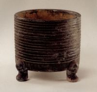 說 明: 此奩仿漢代造型,器里外滿施綠釉,外壁從口到底由等距弦紋作飾.整個器皿端莊雋秀.