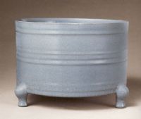 說 明: 造型仿漢代銅奩式樣,屬溫酒用器.胎體較薄,里外滿施淡天青色釉.此奩是代表汝窯燒造水平的杰作.