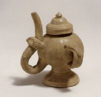說 明: 施青中泛黃釉,此壺構(gòu)思新穎,造型奇特。