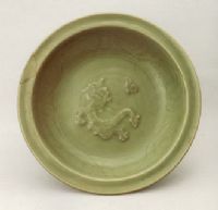 圖片名稱: 龍泉窯青釉帖花獨龍戲珠折沿盤