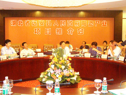 會(huì)上,首先播放了《相約遠(yuǎn)安》專題片,介紹了遠(yuǎn)安縣的陶土資源。隨后縣長鄭廷貴介紹說,遠(yuǎn)安縣是三峽工程所在地,為三峽工程建設(shè)安置了大量移民。為確保三峽移民安穩(wěn)致富,該縣充分利用本地豐富的建材資源,擬建陶瓷工業(yè)園。而佛山市是陶瓷企業(yè)聚集區(qū),有相當(dāng)部分企業(yè)隨著產(chǎn)業(yè)結(jié)構(gòu)調(diào)整將逐步轉(zhuǎn)移,兩地合作有一定的基礎(chǔ)。