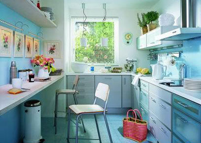 另外,用緊湊型熒光燈照明是當(dāng)前小型廚房常采用的一般照明方法;其特點(diǎn)是光效高、照明效果好,安裝使用方便。嵌入式熒光燈具造型美觀大方,光色柔和怡人,突出顯示了廚房的明凈感。熒光燈具組合照明,加上潔白的臺(tái)面與淡色的地面,廚房內(nèi)一片明亮。