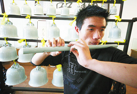 龍泉市中等職業(yè)學(xué)校音樂教師柳朝西十分幸運,這些天來,他一有空就鉆到王軍港的家中去敲一敲青瓷樂器。“那種音質(zhì),就像高山流水一樣一直流進(jìn)了心坎里,讓人感受到一種純真和自然。”