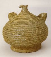 說 明: 原始瓷器。鷹頭形小口,斜長(zhǎng)頸,溜肩。通體飾密集弦紋。
