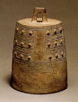 說 明: 仿青銅鐘形制,器表施有一層晶亮的黃色薄釉。制造精巧,仿造逼真。