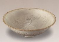 說 明: 內(nèi)外均施青白釉,口沿?zé)o釉。劃花紋飾線條簡(jiǎn)練流暢。
