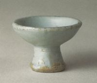 說 明: 侈口,淺腹,凹底,小喇叭形足。白胎,施卵白色釉,底無釉。