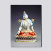 首都博物館藏。此尊頭梳高髻,發(fā)髻前有小化佛——阿彌陀佛,為觀音菩薩身份的重要標識。面容端莊,雙目下視,神態(tài)慈祥。大耳垂肩,耳下垂圓環(huán)。結(jié)跏趺端坐于仰覆蓮臺座上,頭略右傾,雙手下垂結(jié)印,并各持一蓮莖,蓮花齊肩開放。上身不著衣,左肩至右肋斜搭羚羊皮,下身著紅色僧裙,腰間系以金色腰帶。全身還有金色的瓔珞、臂釧、腕釧、足釧等飾物。整尊造型大方,氣質(zhì)高雅,瓷質(zhì)細膩、瑩潤,色彩鮮艷,具有乾隆宮廷造像的鮮明特點。座底有封藏。