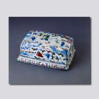 首都博物館藏。長方形,分8個格子,蓋面微鼓,直壁,圈足。蓋面及外壁以紅、淡綠、深綠、黃、褐彩繪成周敦頤愛蓮圖、高士圖和牡丹、梅花紋。盒座上繪卷草紋,近足處繪蓮瓣紋,色彩濃艷,充分反映了萬歷五彩瓷的風(fēng)格。底部書青花長方框“大明萬歷年制”6字單行楷書款。