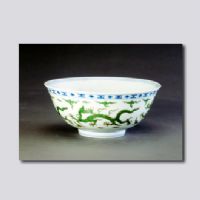 首都博物館藏。侈口,深腹,圈足。碗心及外壁繪云龍紋。其裝飾技法是:先在瓷胎上繪出青花紋樣,刻出云龍輪廓圖案,經(jīng)高溫?zé),再用黑彩勾邊并填以綠彩,二次入爐低溫?zé)。胎色潔白?xì)致,釉質(zhì)純凈溫潤。