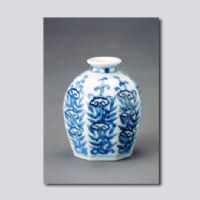 首都博物館藏。六棱形。侈口,束頸,溜肩,鼓腹,圈足。器身飾串枝靈芝紋。器底書青花“大清雍正年制”6字3行楷書款。鼻煙壺是盛放鼻煙的器皿,亦稱煙壺。始創(chuàng)于清康熙朝,清朝英文音譯稱“拿乎薄土”或“士拿乎巴突盧”。其特征壺口小,腹部大,壺蓋帶一小勺,伸入壺內(nèi)取用。