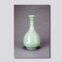 首都博物館藏。撇口,細(xì)長頸,溜肩,垂腹,圈足。頸部飾3道弦紋,腹部印凸花海水云龍紋,展示了行龍出沒于洶涌大海的場(chǎng)景。胎質(zhì)細(xì)膩呈青灰色,釉質(zhì)純凈,青中閃綠。器物制作規(guī)整,是元代龍泉窯的上乘之作。