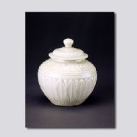 首都博物館藏。直口,豐肩,鼓腹,圈足。通體施白釉,蓋與罐肩部刻覆菊瓣紋飾,腹部凸雕三重仰蓮瓣紋。底足內(nèi)刻劃“官”字款。