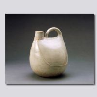 首都博物館藏。扁圓形。筒狀小口,另一側(cè)有提梁,垂腹,平底。通體施白釉,施釉不及底,釉面有細(xì)碎開片?谘叵掠幸蝗Υ劣〖y,腹部兩側(cè)及下腹部飾一周仿皮條狀凸棱。釉面瑩潔,造型渾厚。