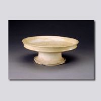 首都博物館藏。口微外撇,淺腹,平底,空心高足。盤內(nèi)心有六個支燒痕。通體施白釉,釉下施化妝土,盤外施釉不到底,釉面布滿細碎開片。胎呈淺灰色,胎體厚重。