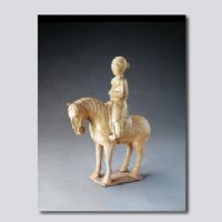 首都博物館藏。明器。騎俑與馬俑分別模制后在捏合成一體,通體施黃釉。頭發(fā)后梳,頭后有發(fā)髻。身穿右衽翻領(lǐng)窄袖胡服,腰束帶,衣紋自然下垂,足蹬長靴,雙手相合。其裝束近于男裝,真實(shí)地反映了當(dāng)時(shí)盛行女子以著男裝為時(shí)尚的社會風(fēng)氣,與史料 “開元初,從駕宮人騎馬者,皆著胡帽,靚妝露面,無復(fù)障蔽,……或有著丈夫衣服靴衫,而尊卑內(nèi)外斯一貫矣” 記載相吻合。馬立于長方形扁平托板上,鞍韉俱全,但無障泥及華麗的裝飾,反映了騎乘者身份比較低微,應(yīng)為侍女。