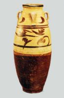 圓口,卷唇,長圓腹,平底微內(nèi)凹,近口處附四扁帶形系。施白釉至腹中部,并用褐彩繪草葉紋,草草幾筆,風格粗獷,寫意生動。白地褐(黑)花品種,宋代北方磁州窯,它將中國繪畫藝術(shù)與制瓷工藝相結(jié)合,創(chuàng)造了一種富有筆情墨趣的瓷器裝飾新品種。磁州窯對各地制瓷業(yè)有廣泛影響,皆有燒制同類產(chǎn)品,形成了磁州窯系。此瓶是安徽蕭窯燒造的具有磁州窯風格的瓷器。