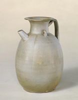 壺撇口,束頸,溜肩,長圓腹,圈足。通體呈四瓣瓜棱形,肩部一側(cè)置短流,另一側(cè)置曲柄,與流、柄成十字形的頸、肩之間置雙系。通體內(nèi)外及圈足內(nèi)均施青釉。此壺造型圓潤飽滿,釉質(zhì)潤澤,為晚唐越窯的代表作品。