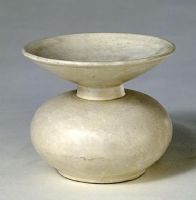 奓斗口外撇,口沿呈漏斗形碗狀,扁圓腹,平底。器里外施白釉,底無釉。此件奓斗胎質(zhì)潔白細膩,釉色瑩潤雪白,造型規(guī)整大方,在唐代白瓷中屬上乘之作。