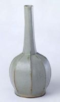 瓶直口,長頸,腹部呈八棱形,圈足外侈;野咨,質(zhì)致密。釉呈淺青綠色,唐人陸龜蒙詩云:“九秋風露越窯開,奪得千峰翠色來”,道出了越窯青瓷的釉色特點。