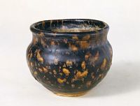 罐唇口,短頸,深腹,淺圈足,足底露胎。外壁施玳瑁釉,釉面滋潤,黑色底釉中閃現(xiàn)大小不同的黃色斑塊,分外醒目。