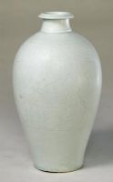 瓶小口出邊,溜肩,肩下漸收,內(nèi)圈足。通體施青白釉,腹部刻纏枝花卉。此梅瓶造型比宋代較為典型的修長(zhǎng)形梅瓶略顯粗短。所刻花紋在勻凈的青白釉面上若隱若現(xiàn),青白相映,素雅恬靜。景德鎮(zhèn)窯青白釉瓷器胎質(zhì)潔白,聲音清脆,因此有專家認(rèn)為傳說中對(duì)“柴窯”的品評(píng),所謂“青如天,明如鏡,薄如紙,聲如磬”,很可能是指這種青白釉而言。