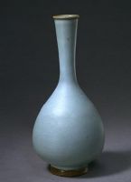 鈞窯被稱為宋代五大名窯之一,其主要釉色有月白、天藍(lán)、紫紅等,胎重釉厚。此瓶為宋鈞窯的民窯產(chǎn)品。民窯器物形制多為碗、盤(pán)、瓶、罐之類生活用品,釉色以天青或天藍(lán)釉居多,無(wú)官鈞之玫瑰紫和海棠紅色。此瓶造型別致,釉色勻凈,為民窯中較好的作品。