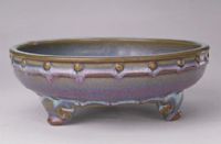 鼓釘洗是鈞窯瓷器中常見的造型品種,這種富于裝飾性的器物配以如意頭形足活潑輕巧,匠心獨具。此為宋代宮廷陳設(shè)用瓷。
