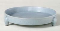 此器造型規(guī)整,釉呈淡天青色,柔和溫潤。它應與三足樽配套使用,用以承放三足樽。