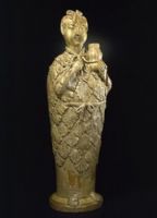 這是一尊宋代耀州窯燒造的青釉塑像,塑造一中等身材的佇立男像。其形像昂首挺胸,雙目炯炯有神,平視前方,兩腮微鼓,雙唇緊閉,神態(tài)安詳。頭戴蝴蝶結(jié)飾物,身披由樹葉綴連而成的長衣,左手托寶瓶,右手執(zhí)草葉于胸前,腰間系一布帶,赤足立于圓托上。通體罩青中略帶黃色之釉。
