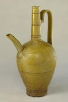 壺直口,細長頸,豐肩,長圓腹,圈足。一側為八棱形壺流,流細長彎曲,根部飾一皮扣狀裝飾,另一側為帶狀長柄,連于頸肩。自壺口至近足處,通體飾弦紋6組。器身施黃釉,釉面光亮瑩潤。
