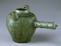 壺小口,口內(nèi)收,壺身為四瓣瓜棱形,肩部一側(cè)有多棱形短流,相對應(yīng)的另一側(cè)為雙條繩形系。壺腹一側(cè)有竹節(jié)形橫柄,柄端凸起一小鈕。肩部飾雙凸弦紋,通體刻劃大小扇形紋,柄與壺身連接處以螺旋形刻劃花紋巧加修飾,十分別致。壺施綠釉,鮮翠欲滴,明亮可愛。
