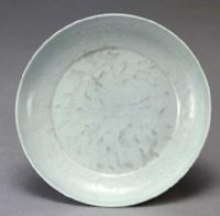 盤敞口,淺弧壁,圈足。胎骨堅(jiān)細(xì)潔白,內(nèi)外施釉,釉層較厚,呈失透狀,釉面瑩潤,釉色白中泛青,恰似鵝卵色澤,故名“卵白釉”。足內(nèi)露胎無釉。